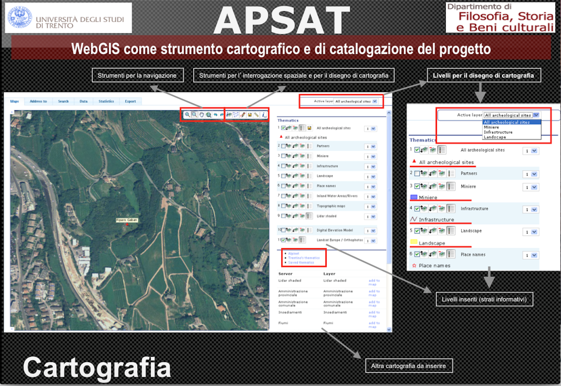 In una prima fase sono state schedate in un WEB-GIS: (a) la cartografia storica, prendendo come base quella catastale austriaca della metà del XIX secolo che è stata georeferenziata e per le aree campione e vettorializzata a livello di singoli particellari; (b) la toponomastica; (c) le fonti scritte, peraltro assenti o fortemente lacunose prima del XII secolo; (d) i dati archeologici pregressi; (e) le informazioni sistematiche ricavabili dal LiDAR e dalle foto aeree, con controllo a terra delle principali evidenze e anomalie; (f) le architetture, studiate stratigraficamente e nelle tecniche costruttive. Ovvero gli aspetti più appariscenti e meglio documentabili di un paesaggio antropico, senza una gerarchia a priori e senza un taglio cronologico prefissato.