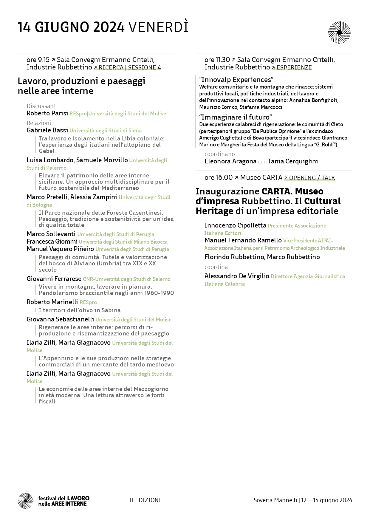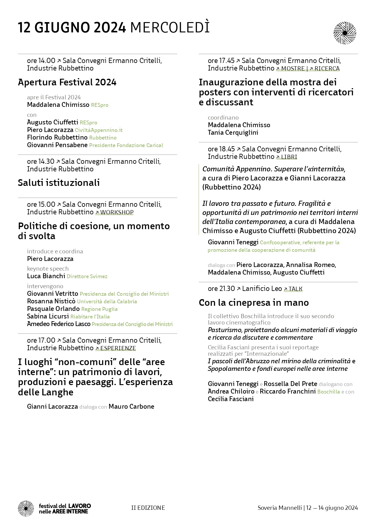 Dal 12 al 14 giugno 2024, a Soveria Mannelli (CZ) è organizzata la seconda edizione Festival del Lavoro nelle Aree Interne, realizzato dall’associazione RESpro – Rete di storici per il Paesaggio, Rubbettino Editore e Fondazione Appennino.