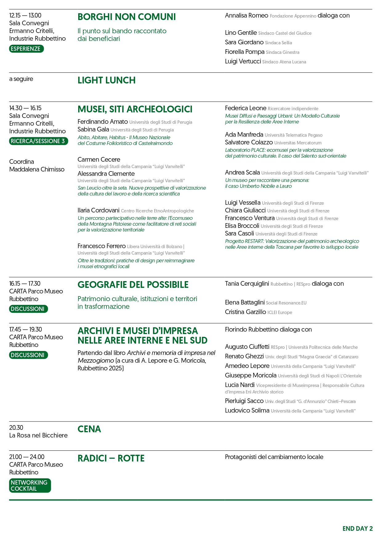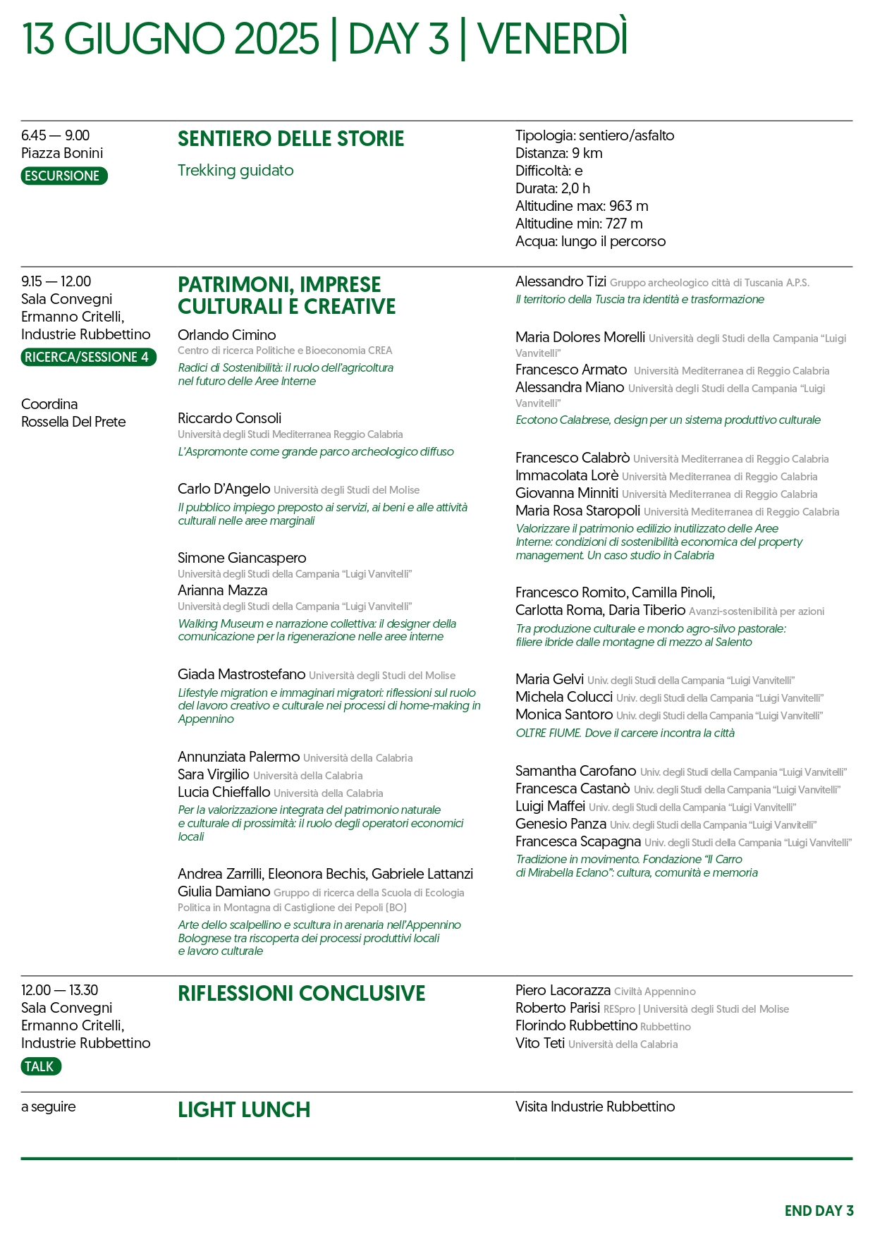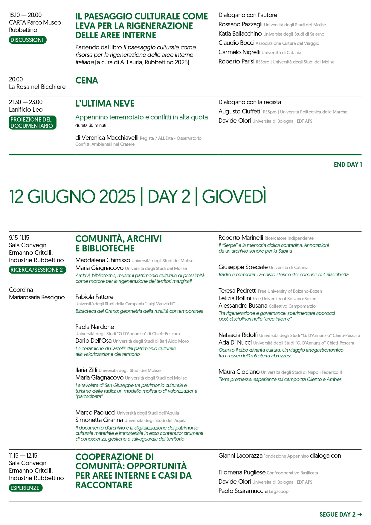 Numerosi gli eventi e i talk in programma che comprendono non solo la condivisione di percorsi di studio e di ricerca ma anche di esperienze, come l’evento di networking “Radici rotte”, previsto per la serata del 12 giugno, un momento dedicato all’incontro e al dialogo tra attori del territorio: imprenditori, associazioni, professionisti e cittadini si confronteranno per condividere esperienze, creare connessioni e costruire nuove sinergie. Un’occasione per intrecciare storie, idee e prospettive sul futuro delle aree interne.